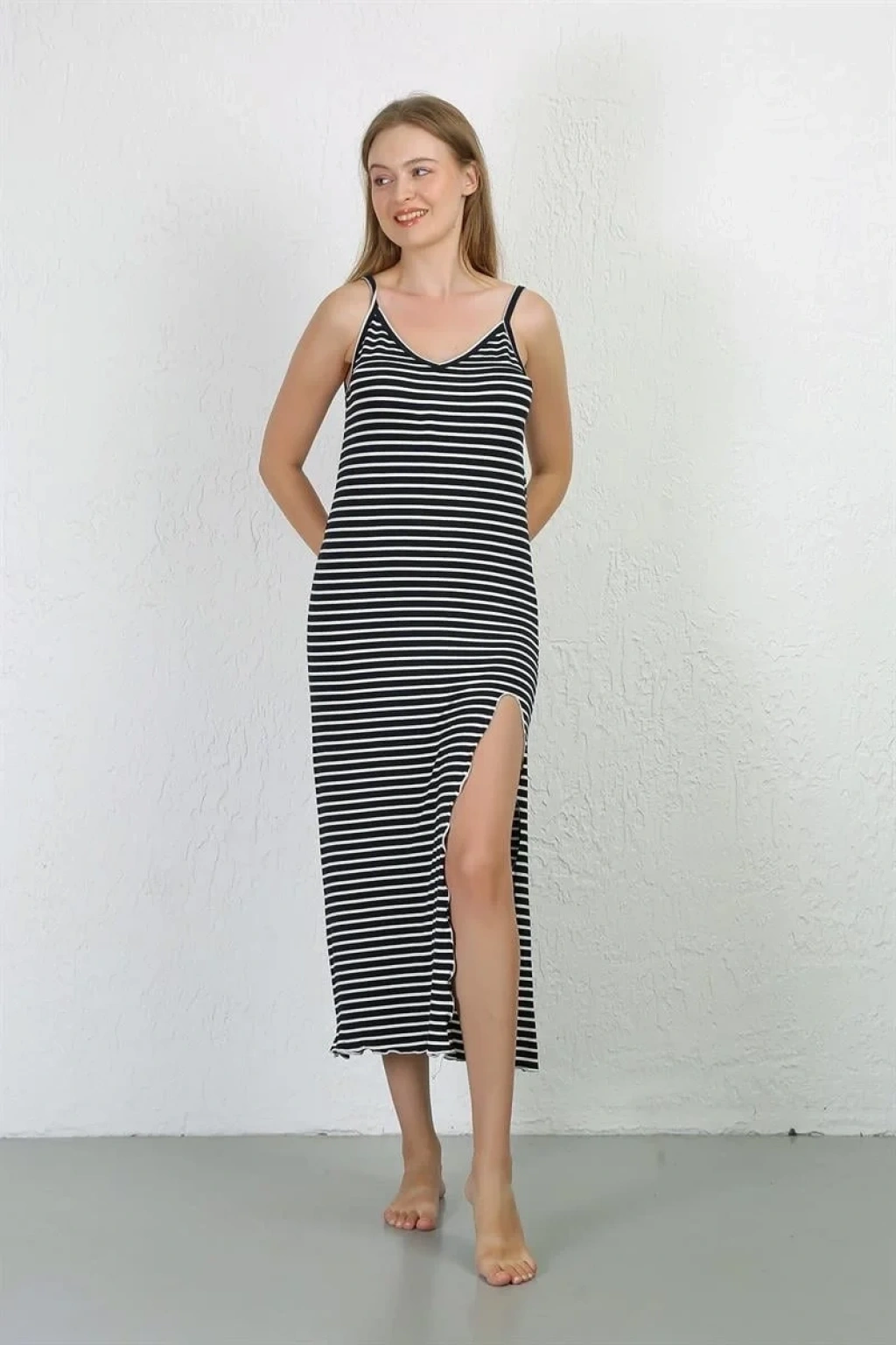 Çamaşır Kenti İp Askılı Uzun Yırtmaçlı Penye Gecelik ile hem şık hem de rahat bir gece geçirin.