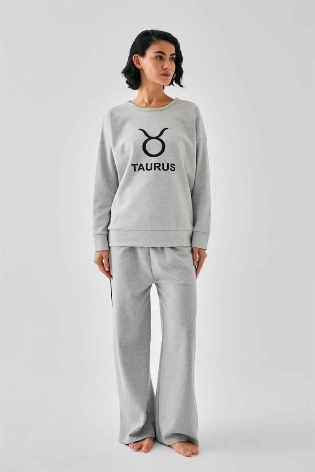 Çamaşır Kenti Kadın Gri Boğa Burcu Oversize 2 İplik Eşofman Ev Giyim Takımı, rahatlığı ve şıklığı bir arada sunuyor.