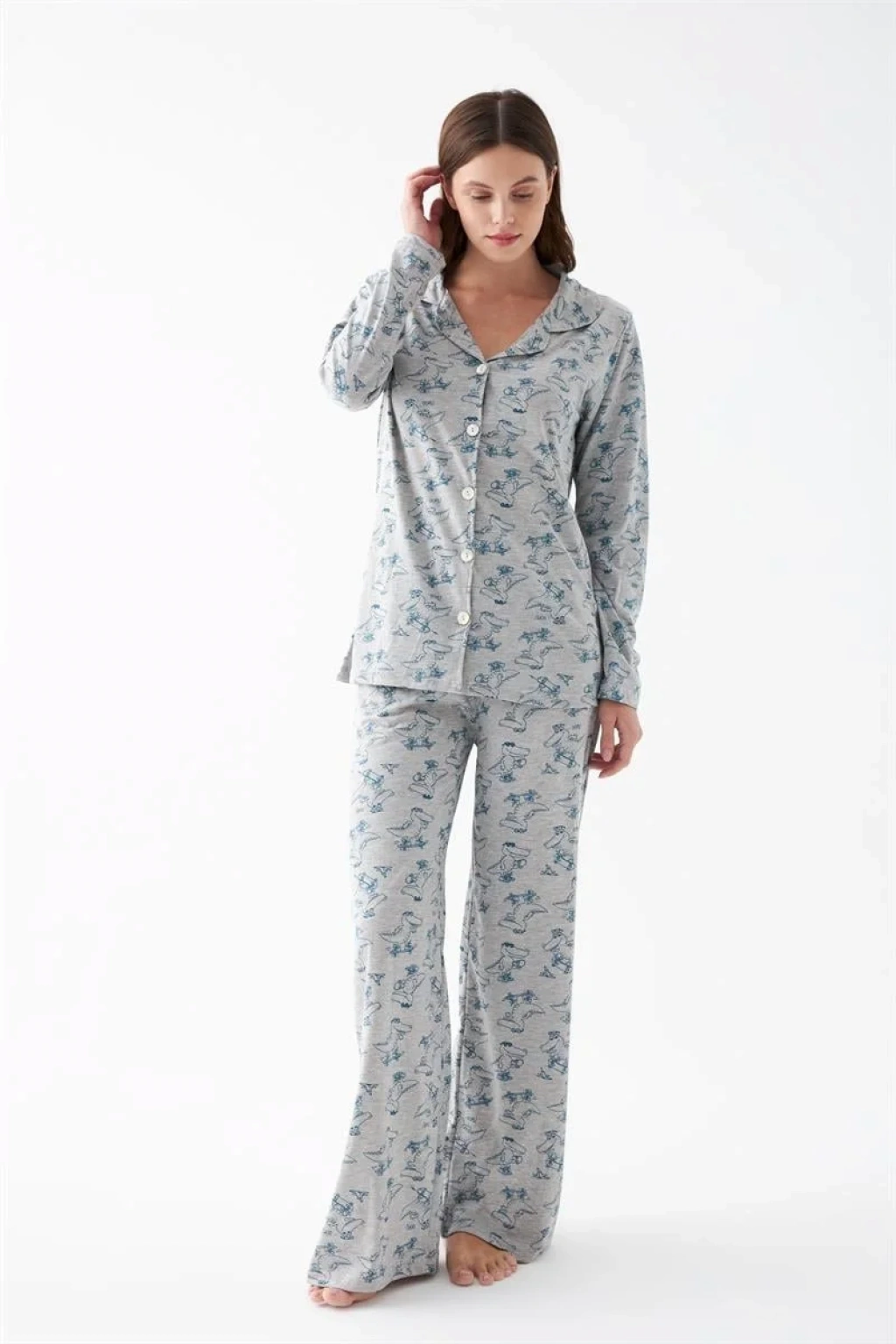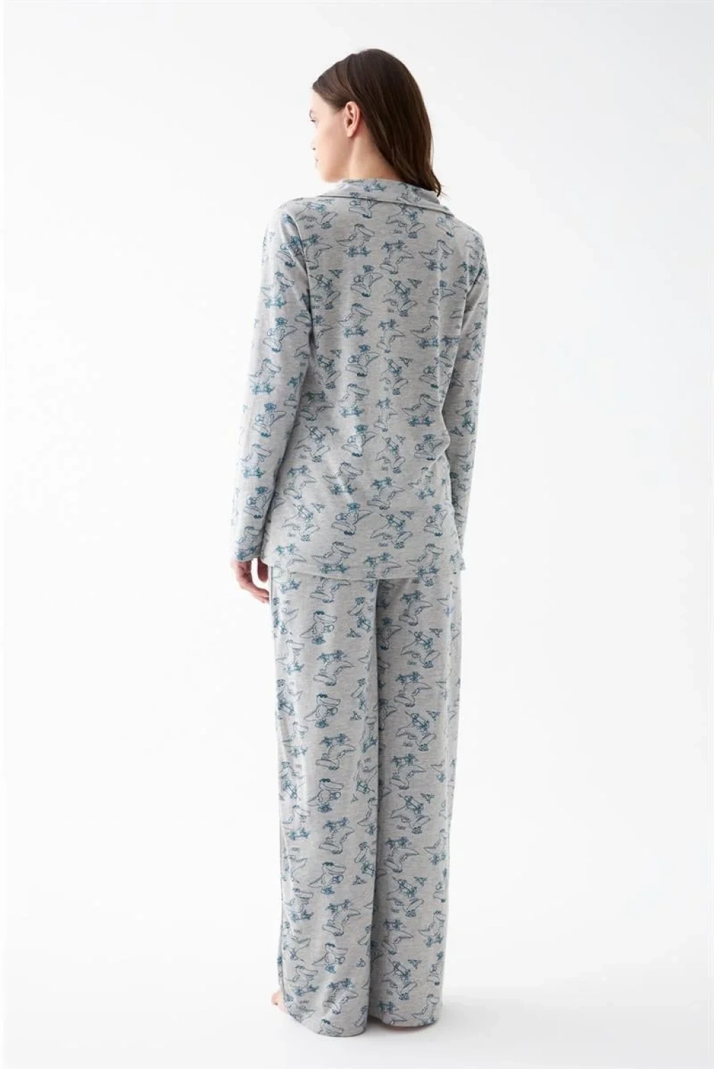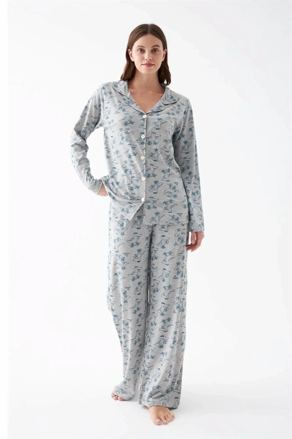 Çamaşır Kenti markasının kadın gri desenli düğmeli pamuklu pijama takımı, konfor ve şıklığı bir arada sunuyor.