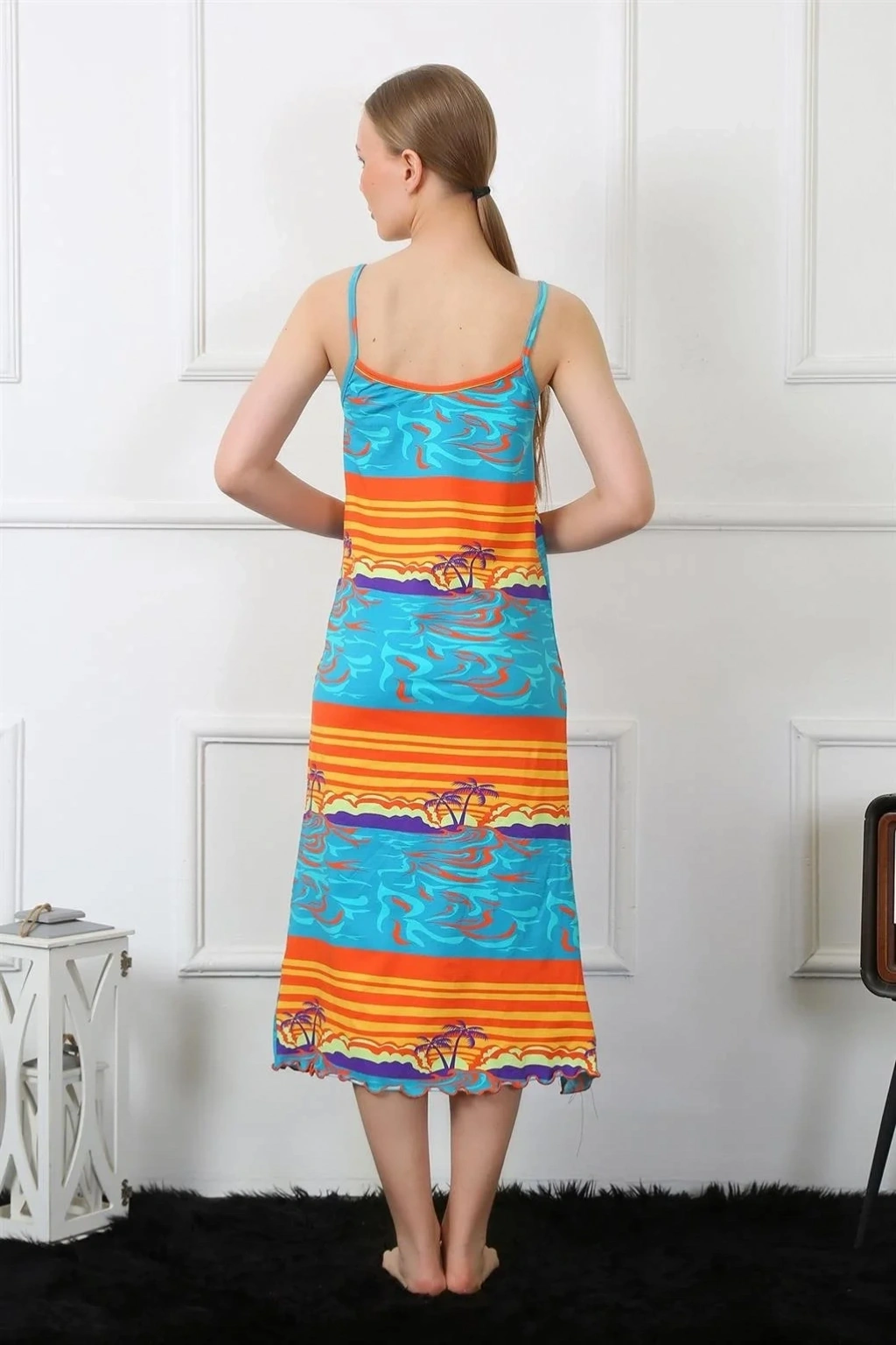 Çamaşır Kenti'nin mavi ip askılı uzun geceliği, hem şık hem de rahat bir seçenektir. İnce ip askıları ve dantel detaylarıyla tasarlanan bu gecelik, feminen bir görünüm sunar.