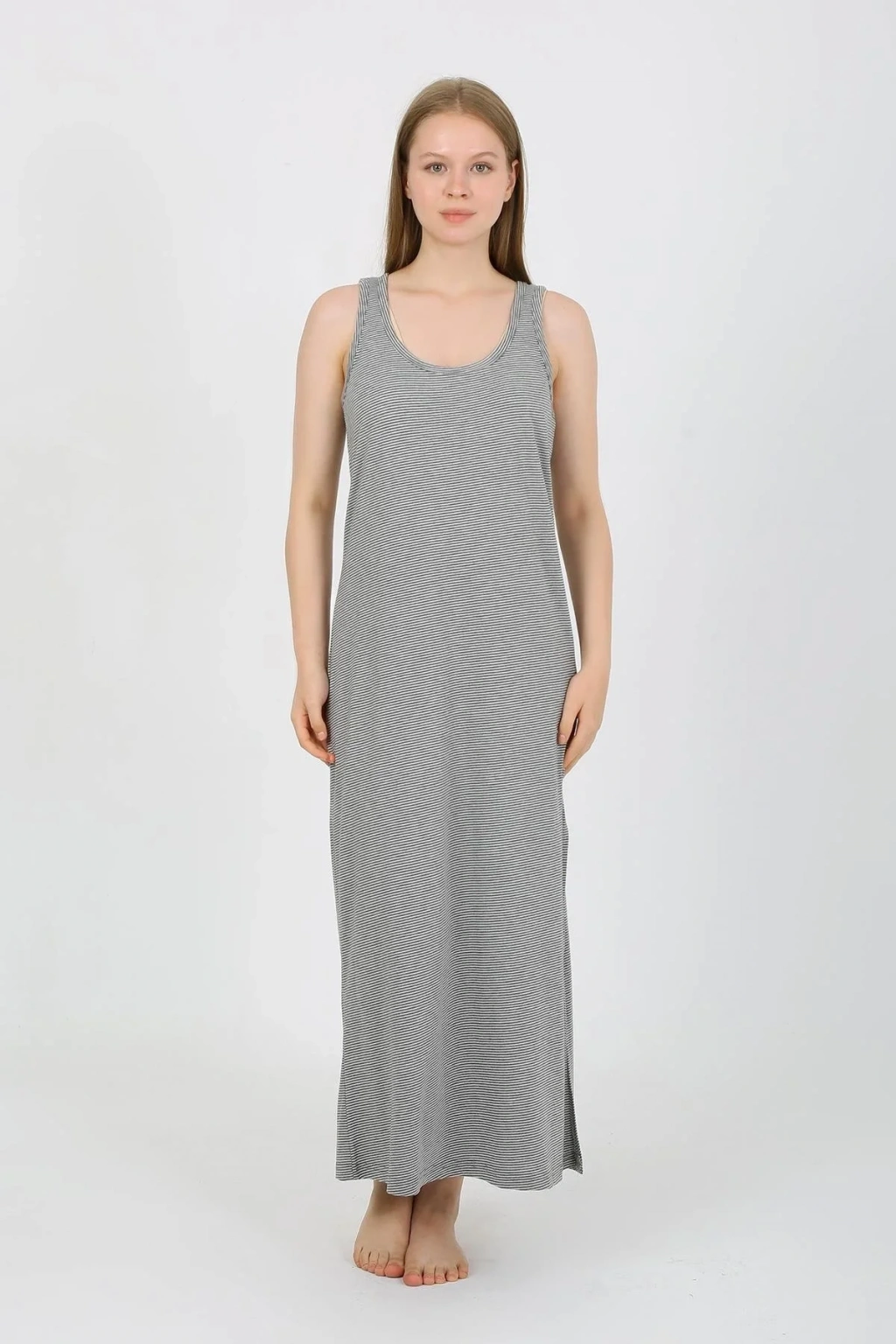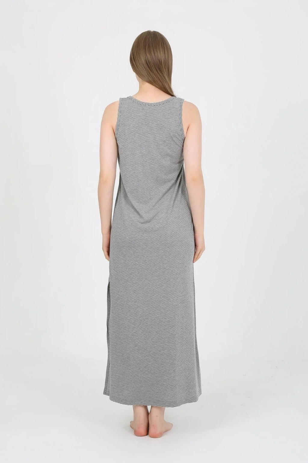 Çamaşır Kenti Kalın Askılı Yırtmaçlı Uzun Gri Gecelik ile hem güzel hem de rahat hissedin!