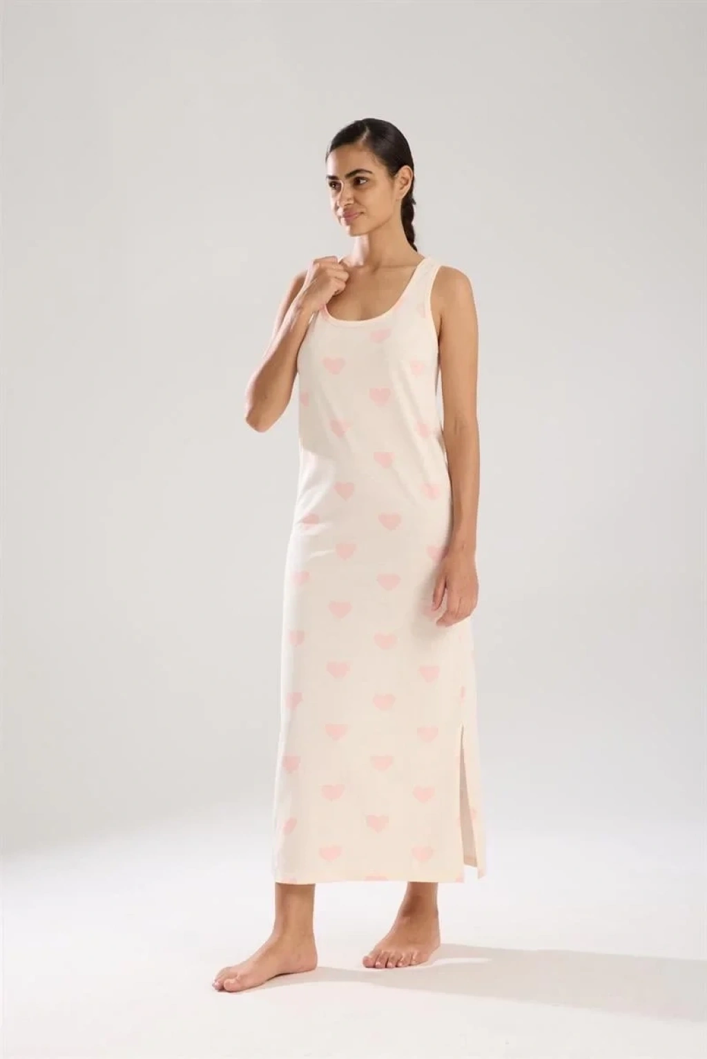 Çamaşır Kenti'nin şık tasarımlı Kadın Kalın Askılı Yırtmaçlı Uzun Pudra Geceliği, konforu ve şıklığı bir arada sunuyor.
