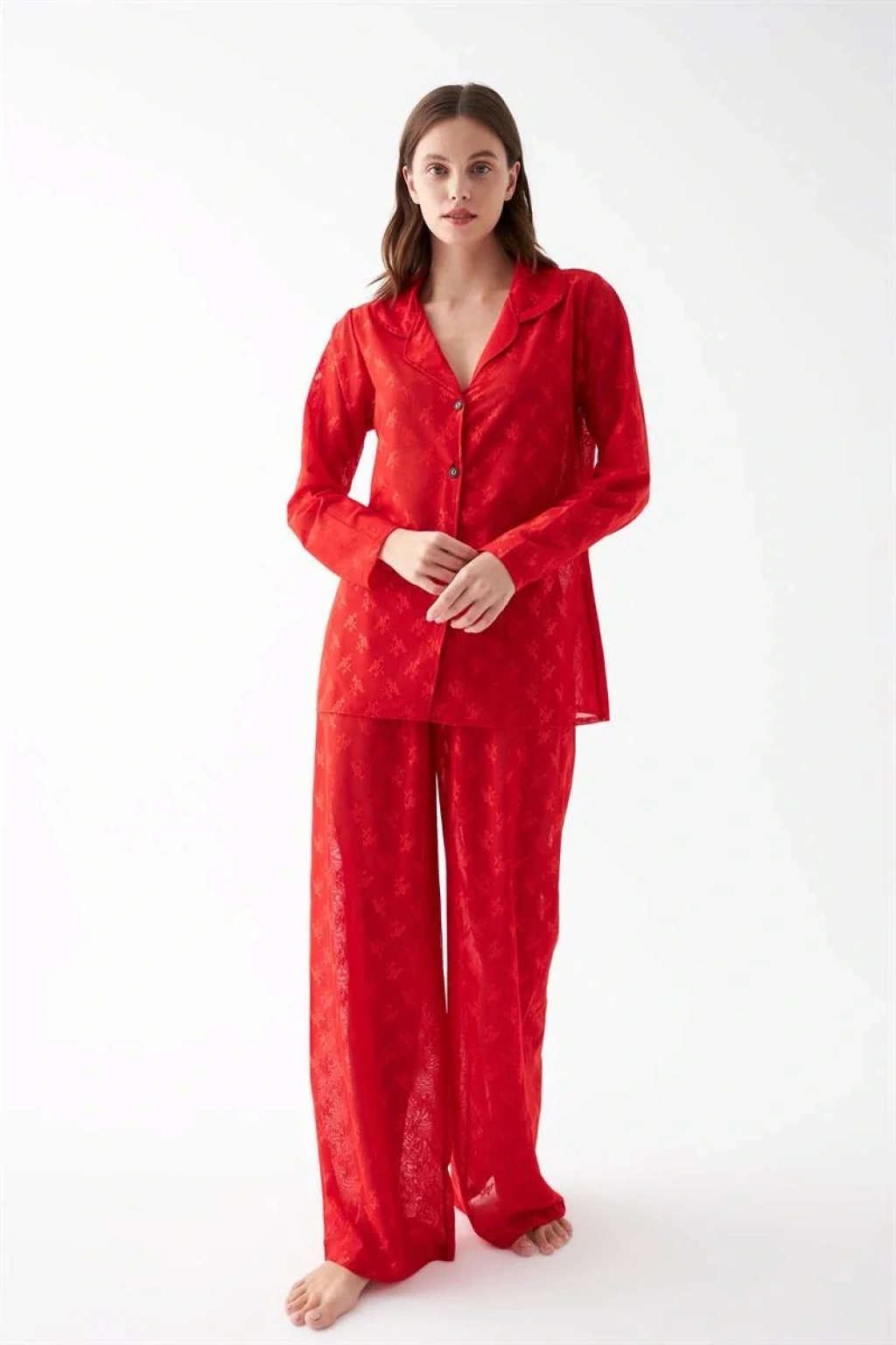 Çamaşır Kenti'nin şık ve rahat tasarımıyla öne çıkan Kadın Kırmızı Şeffaf Jakar Düğmeli Pijama Takımı, gecelerinizi daha keyifli hale getirecek.