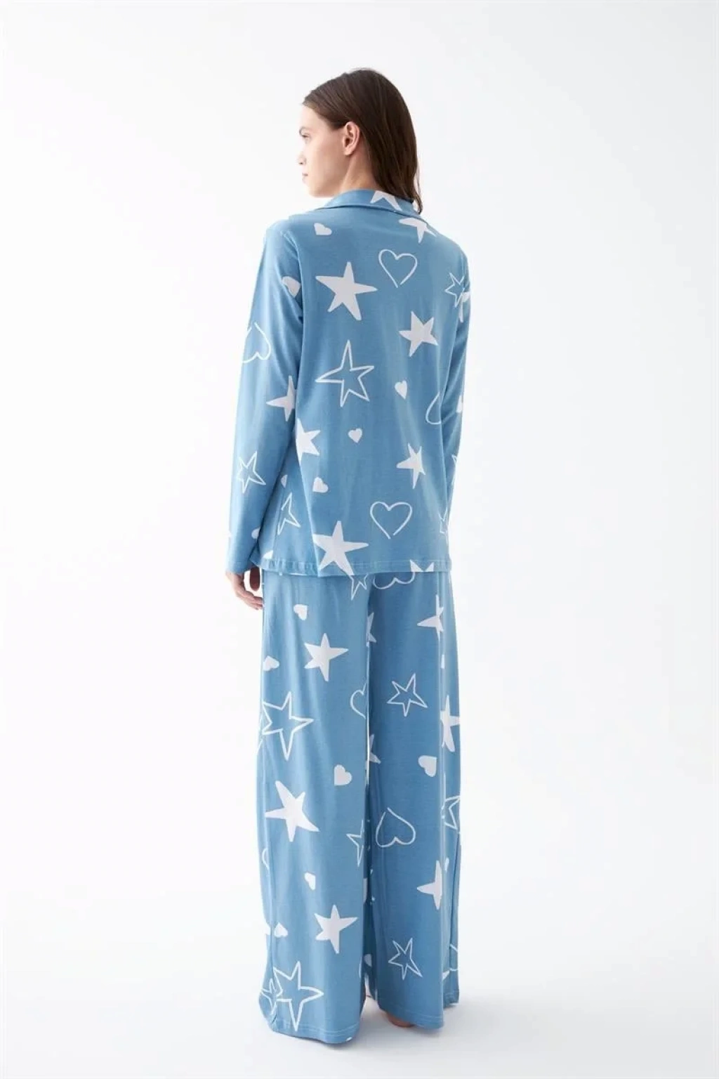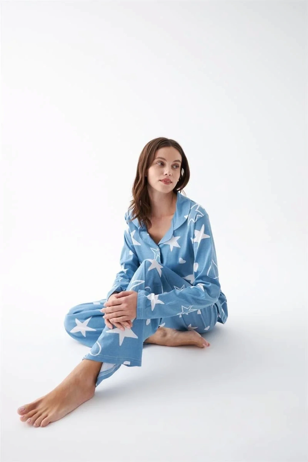 Kadın Mavi Yıldız Desenli Düğmeli Pamuklu Pijama Takımı ile konforlu ve şık bir uyku deneyimi yaşamak artık çok daha kolay!