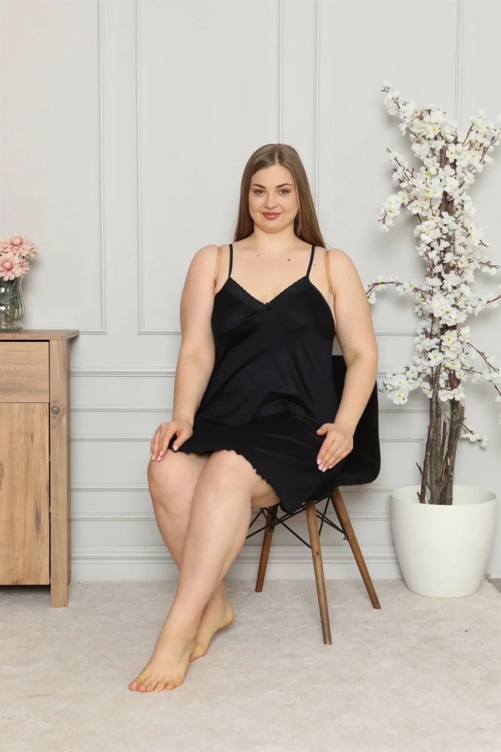 Kadın Pamuklu İp Askılı Büyük Beden Gecelik