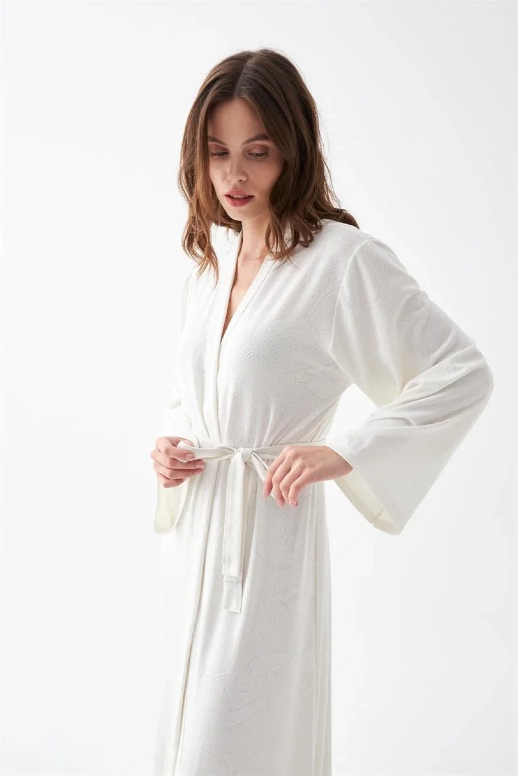 Şıklığı ve konforu bir arada arayan kadınların tercihi olan Çamaşır Kenti Kadın Uzun Ekru Penye Sabahlık, güzel ve rahat bir gece keyfi sunar.