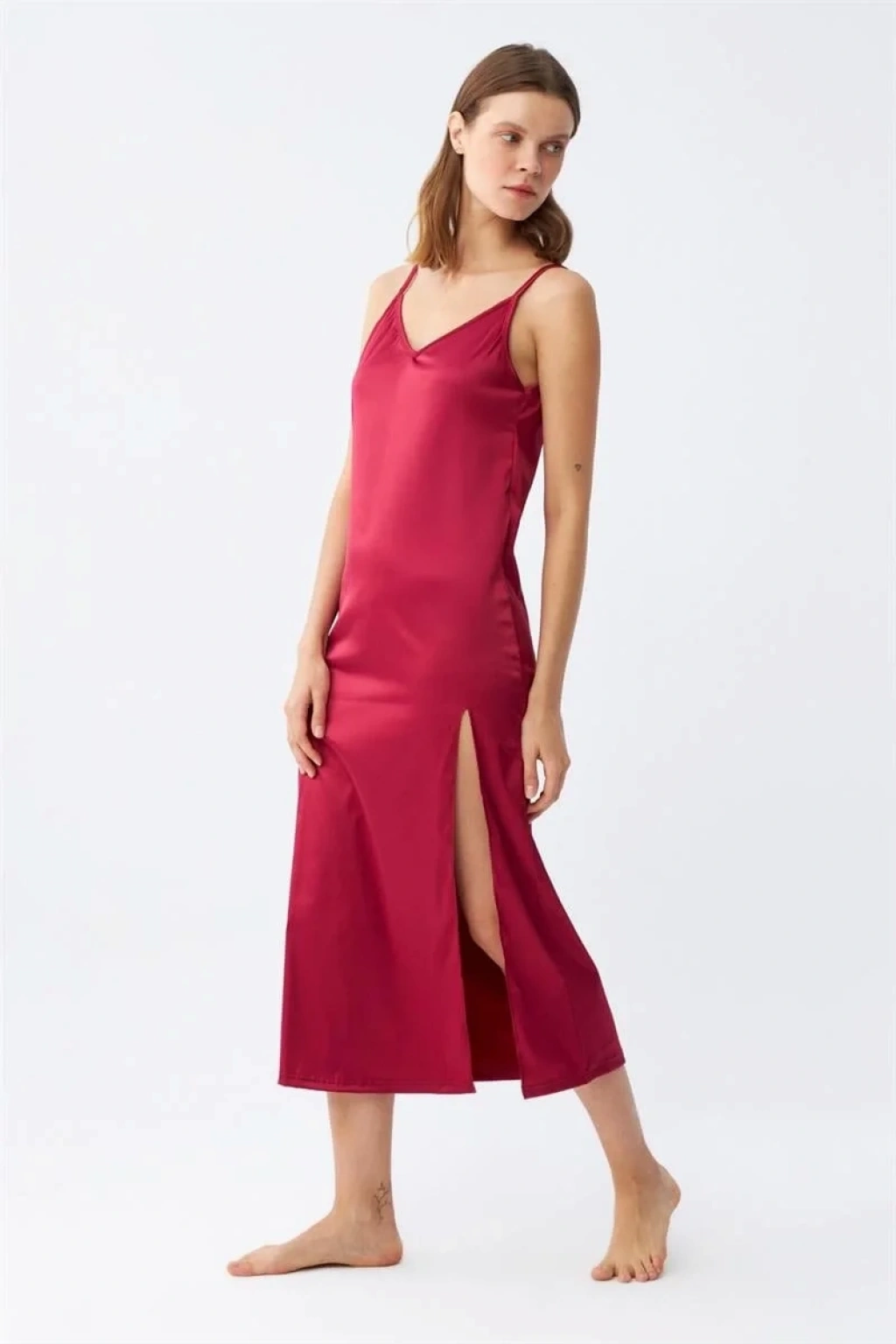 Çamaşır Kenti'nin yepyeni tasarımı olan Yırtmaçlı Uzun Saten Gecelik Bordo ile kendinizi şıklığın ve rahatlığın kusursuz uyumuyla ödüllendirin.