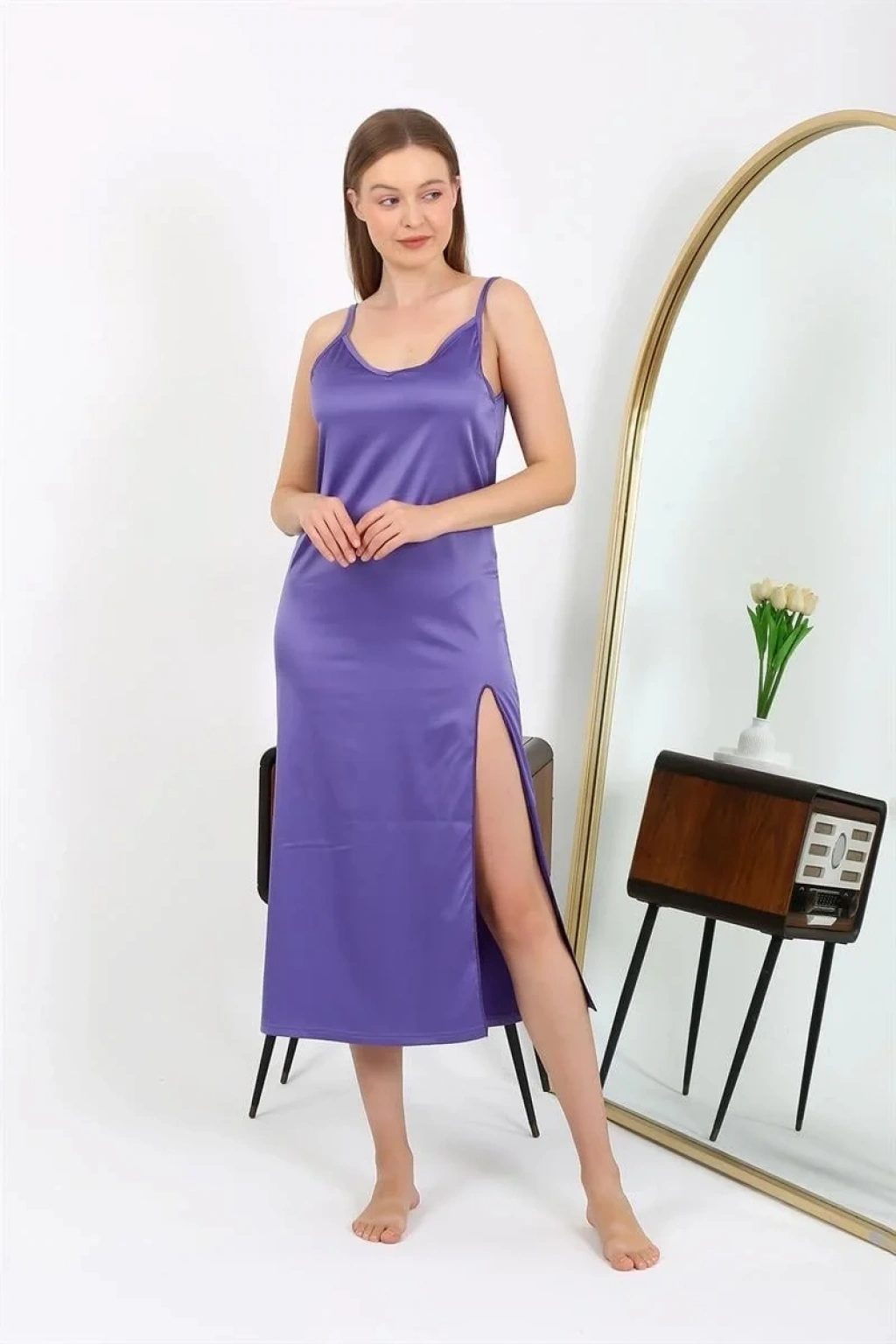 Çamaşır Kenti'nin yepyeni tasarımı olan Yırtmaçlı Uzun Saten Gecelik Mor ile kendinizi şıklığın ve rahatlığın kusursuz uyumuyla ödüllendirin.